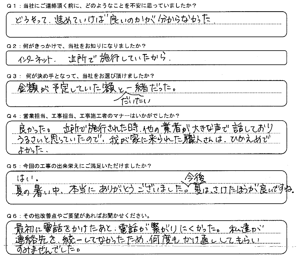 営業担当、工事担当、工事施工者のマナーはいかがでしたか?