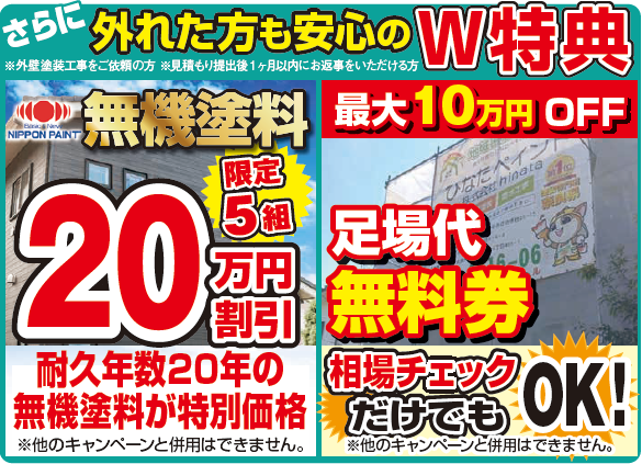 さらに外れた方にも、「無機塗料20万円割引(限定5名様)」または「足場代無料券」の割引券のW特典をプレゼント!外壁塗装をお考えの方は是非プレゼントをゲットしてくださいね♪