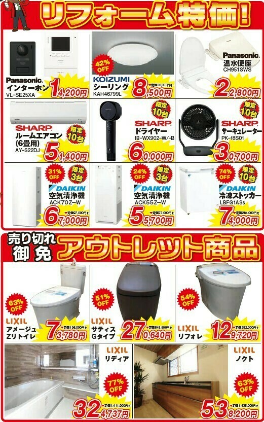 リフォーム特価では、いろいろな商品が大特価でご購入いただけます。またイベント限定特売品も魅力的なお値段でご提供いたします。数に限りがあり売り切れゴメンとなる商品ですので、お目当ての商品がある方は是非お早めにお越しくださいませ!