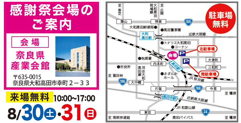 昨年、開催場が少し遠いということでお越しになれなかった奈良県の南部の方々も、今年は大和高田市での開催となりますので、是非お気軽にお越しいただければと思います。